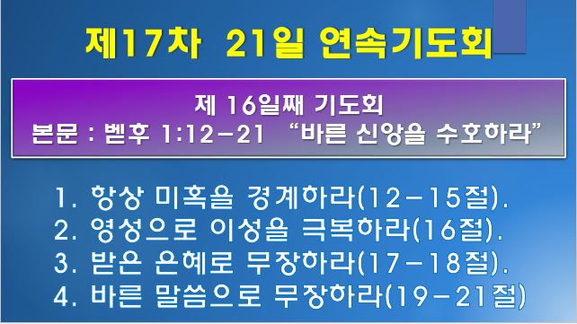 | 21일 연속기도회 16일째 : 바른 신앙을 수호하라 (0) | 2021.07.16 |