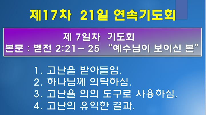 | 21일 연속기도회 2일째: 환난 중에 찾은 소망 (0) | 2021.07.02 |